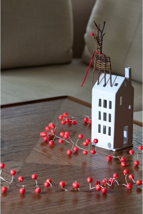 Φωτεινή γιρλάντα με εντυπωσιακές κατακόκκινες, λαχταριστές στρογγυλές μπαλίτσες που μοιάζουν με φρέσκα κόκκινα βατόμουρα. Οι μπαλίτσες είναι επιδέξια δεμένες με διακριτικό και ανθεκτικό σύρμα, προσδίδοντας στην κατασκευή μια μαγευτική και γοητευτική εμφάνιση. Αυτή η λαμπερή γιρλάντα μπορεί να προσθέσει μια ζεστή και εορταστική ατμόσφαιρα σε κάθε χώρο του σπιτιού σας, καθιστώντας την ιδανική διακοσμητική επιλογή για το τζάκι, τη σκάλα ή το χριστουγεννιάτικο δέντρο σας.